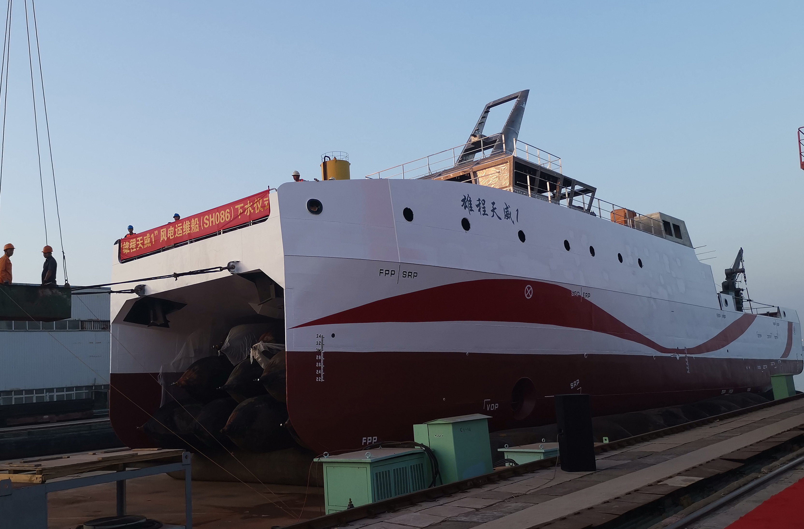 “雄程天威1”號風(fēng)電運(yùn)維船為雙體船,總長49.9米,排水量約600噸,是目前國內(nèi)先進(jìn)的創(chuàng)新型風(fēng)電運(yùn)維船,裝機(jī)容量4.8MW,雙舵槳主推,雙艏側(cè)推,配備賽思億直流組網(wǎng)電力推進(jìn)系統(tǒng)、六自由度波浪補(bǔ)償?shù)浅讼到y(tǒng)和DP-2動力定位系統(tǒng),擁有能在4級風(fēng)海況下進(jìn)行登乘作業(yè)的能力,穩(wěn)性滿足抗8級風(fēng)的能力,核心設(shè)備實(shí)現(xiàn)國產(chǎn)化。