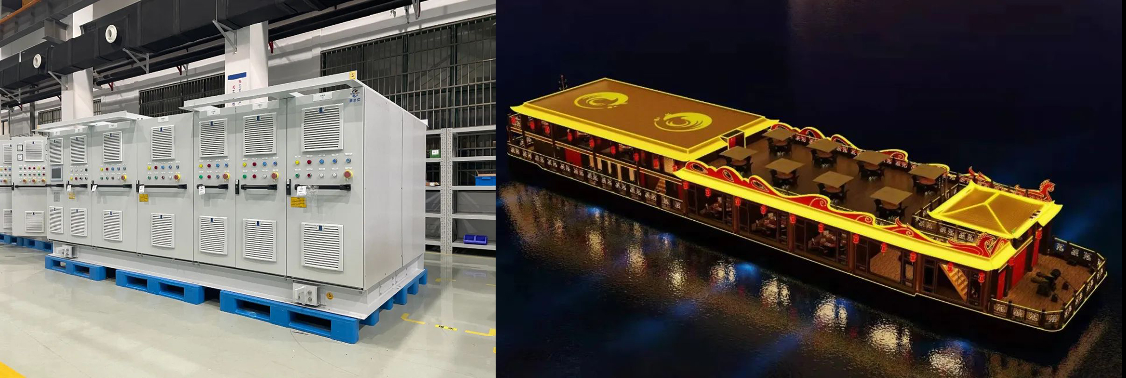“大唐1號(hào)”游船由廣元市武則天文化旅游產(chǎn)業(yè)發(fā)展有限公司打造,由中國(guó)船舶集團(tuán)有限公司第七一九研究所總體設(shè)計(jì)并集成供貨,賽思億國(guó)產(chǎn)變頻電控設(shè)備成為其關(guān)鍵設(shè)備供應(yīng)商,為該系統(tǒng)提供共直流母線裝置。該船總長(zhǎng)50.8m,型寬10.8m,型深2.8m,載客300人,整船鋰電池容量共計(jì)1397.76kWh,是目前西南地區(qū)電池容量最大、船舶尺度最大的純電動(dòng)客船。該船動(dòng)力系統(tǒng)經(jīng)過(guò)賽思億自主知識(shí)產(chǎn)權(quán)的直流母線變頻電控設(shè)備在直流母線進(jìn)行并網(wǎng),驅(qū)動(dòng)2臺(tái)225kW的全回轉(zhuǎn)舵槳,同時(shí)可為船舶日用負(fù)載提供高品質(zhì)的日用交流電源。