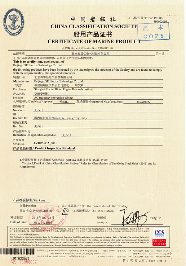 “浙漁科2”號柴電混合動力系統(tǒng)變頻器船檢及漁檢證書
