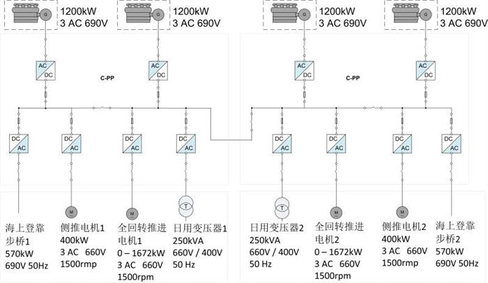 該項(xiàng)目由無(wú)錫賽思億電氣科技有限公司提供的全船直流組網(wǎng)變頻電控系統(tǒng)動(dòng)力總成,供貨范圍包括:直流組網(wǎng)變頻電控系統(tǒng)、柴油發(fā)電機(jī)組、舵槳系統(tǒng)、動(dòng)力定位系統(tǒng)(DP-2)、配電板及機(jī)艙檢測(cè)報(bào)警系統(tǒng)等設(shè)備,順利通過(guò)了首次海試任務(wù),完全符合船東的技術(shù)要求,滿足本船的使用條件,獲得了船東、船廠及設(shè)計(jì)院的高度的贊賞。直流組網(wǎng)技術(shù)在“雄程天威1”號(hào)上的應(yīng)用,不僅解決了雙體船機(jī)艙空間小的問(wèn)題,還可充分滿足在風(fēng)場(chǎng)惡劣海況下對(duì)船舶動(dòng)力定位(DP-2)、登乘系統(tǒng)的高動(dòng)態(tài)響應(yīng)能力的技術(shù)要求,進(jìn)一步提升了船舶的動(dòng)態(tài)響應(yīng)特性。