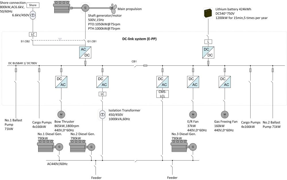鼎衡15000噸化學(xué)品船,船舶總長147米,型寬22米,入級(jí)BV船級(jí)社,抱軸電機(jī)額定功率為1000kW,同時(shí)配置424kWh電池達(dá)到削峰填谷的目的,該船舶混合動(dòng)力系統(tǒng)采用直流組網(wǎng)形式,將主機(jī)、發(fā)電機(jī)組、電池動(dòng)力整合并高效分配,為用戶提供高效、綠色、可靠的混合動(dòng)力。將于2021年年初完成安裝調(diào)試。